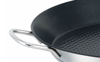 Las paellas preparadas para vitrocerámica o inducción tienen una gran base metálica que ayuda a repartir el intenso calor que proporcionan estos sistemas en una mayor superficie, evitando que se quemen gran parte de los granos de arroz cuando queda poco caldo, aunque es muy difícil que no pase (véase apartado “El Fuego”). Estos recipientes llevan un recubrimiento antiadherente que evita en gran medida que se nos pegue el arroz al fondo.